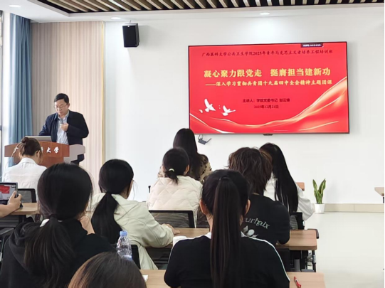 仪式上,陈茜宣读了“青马班”学员名单,详细讲解了学院青马工程的培养体系与实施路径,为后续培养工作的有序开展夯实了基础。随后,邹云锋以“凝心聚力跟党走,挺膺担当建新功”为题讲授团课。他聚焦中国共产主义青年团第十九届中央委员会第四次全体会议决议精神,围绕“把握全会背景与核心精神、明确公卫青年奋斗坐标、投身强国实践书写篇章”三大主线,结合公共卫生专业特色,系统解读全会精神要义,引导学员深刻理解共青团的使命与时代青年的责任。最后,他向全体学员提出三点希望:一要坚定理想信念,勇担时代使命;二要练就过硬本领,夯实专业根基;三要志存高远、追求卓越,努力成长为公共卫生领域的拔尖人才。