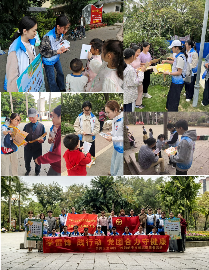 为充分发挥党员的先锋模范作用,传承弘扬新时代雷锋精神,落实“党建带团建,团建促党建”工作思路,推动党建工作与青年育人、专业实践深度融合,3月21日下午,dg百家乐试玩 卫检妇幼党支部联合2328班多名优秀团员代表,前往金花茶公园开展“学雷锋•践行动,党团合力守健康”主题健康科普志愿服务活动。