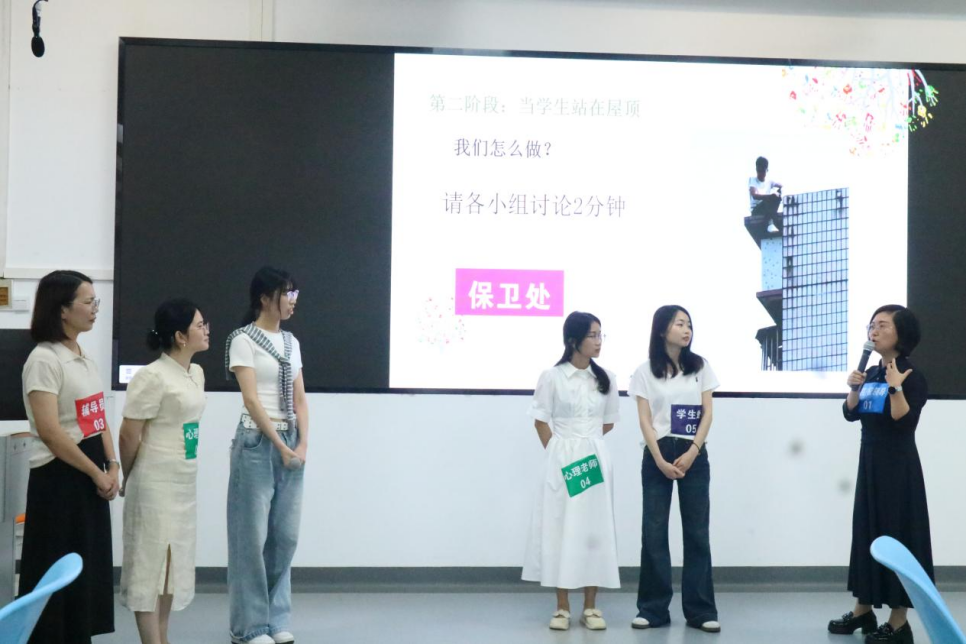 本次培训设置沉浸式实操演练环节,胡宓围绕学生心理危机“发现-处置-应对”三个阶段,将危机干预全流程拆解进行实战教学。6个参训小组根据不同场景开展分组研讨和情景模拟,主讲人针对每组演练逐一复盘,从沟通话术、现场处置、多部门协同等细节精准纠错,并传授规范干预技巧,提升参训人员应对突发心理危机的实战能力。张瑜代表主办方表示感谢,希望各学院结合实际开展常态化实操演练,注重总结反思与深度思考,持续提升应对复杂局面的能力,切实将培训成果转化为工作实效。